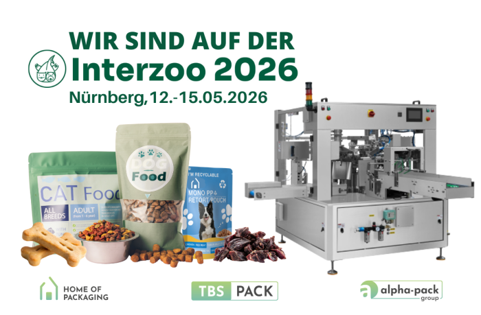 Vom 12. bis 15. Mai 2026 sind wir als Aussteller auf der Interzoo in Nürnberg dabei – der weltweit führenden Fachmesse für Heimtierbedarf. In Halle 4A, Stand 4A-321 präsentieren wir mit tbs-pack und alpha-pack unsere gebündelte Expertise für Verpackungsmaterialien und Verpackungsmaschinen für Tiernahrung.